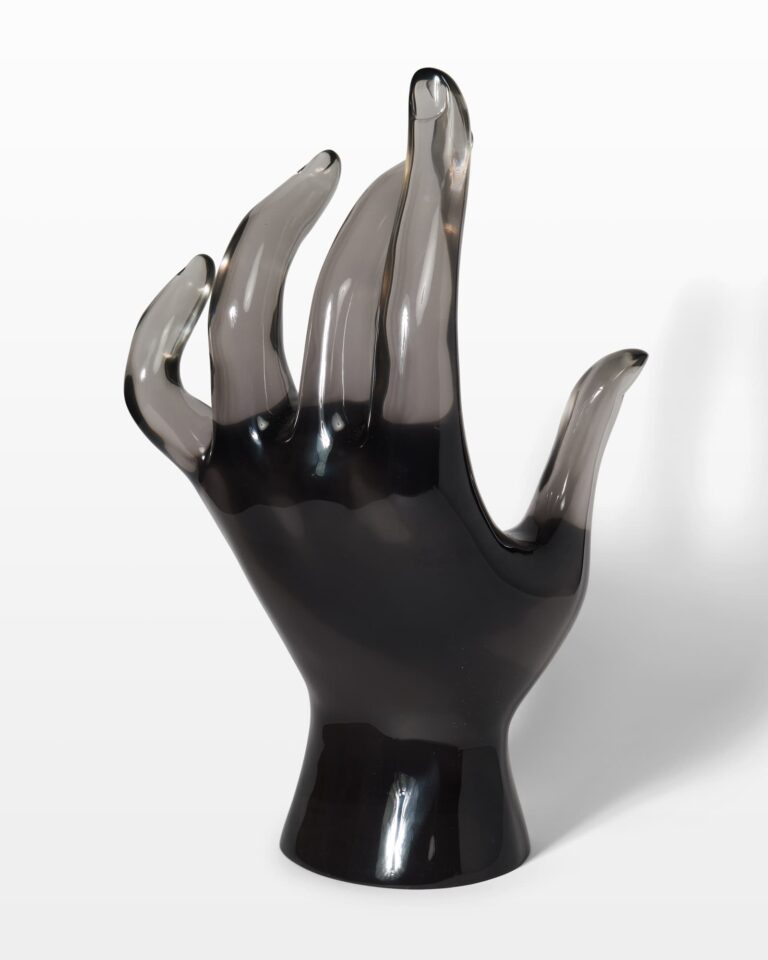 This oversized, polished acrylic hand sculpture is a conversation piece of the highest style. 26″ tall, and heavy, this piece can be used on a table or floor for equal impact.